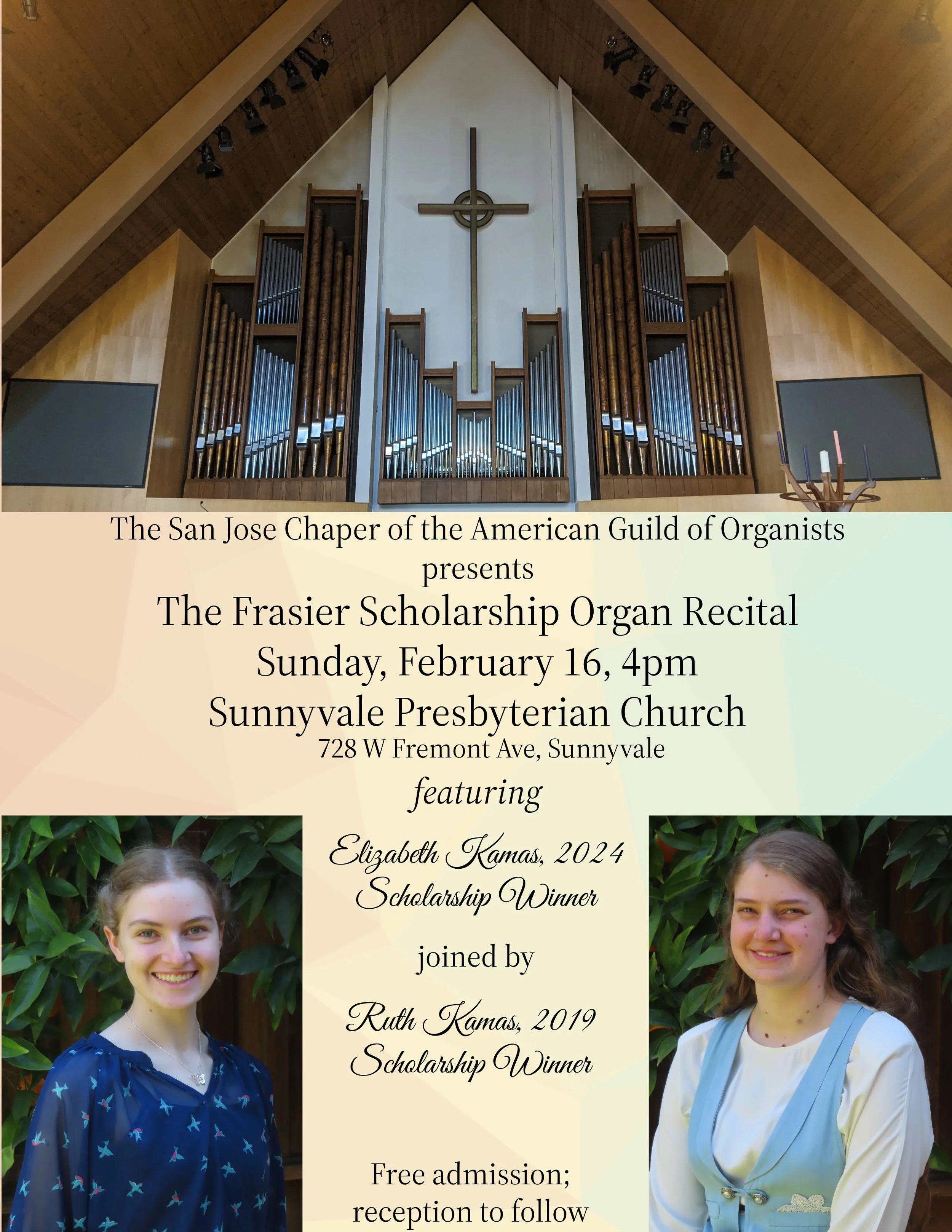 We are delighted to host a one hour recital played by the most recent Frasier scholarship winner, 16-year-old Elizabeth Kamas, joined by her older sister, Ruth (2019 Frasier winner). They will play a variety of classic music (including the famous Toccata and Fugue in D Minor by JS Bach), showcasing the mighty Balcom and Vaughan organ. The concert will close with the theme from Star Wars for organ and piano duet. Also included is a spritely piece written by local composer and AGO member, Angela Kraft Cross.
